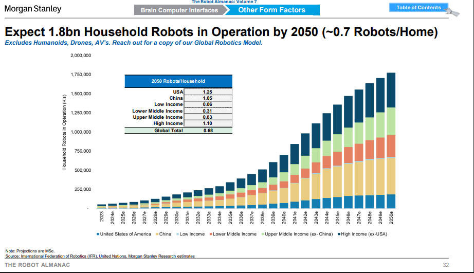 在家庭场景中,专用家用机器东谈主(非东谈主形)已发展多年,举例2002年推出的首台Roomba扫地机器东谈主。这类家具主要自动化清洁、监护等任务,其东谈主工智能相对侧重于旅途磋商和物体检测。摩根士丹利预测,到2050年,巨匠将有约18亿台家用机器东谈主参加运营,平均每户家庭领有约0.68台。其中,好意思国和中国市集的家庭机器东谈主浸透率预测将隔离达到每户1.25台和1.05台,远高于巨匠平均水平。