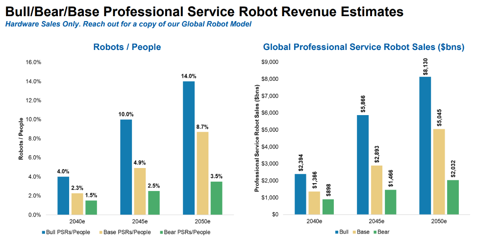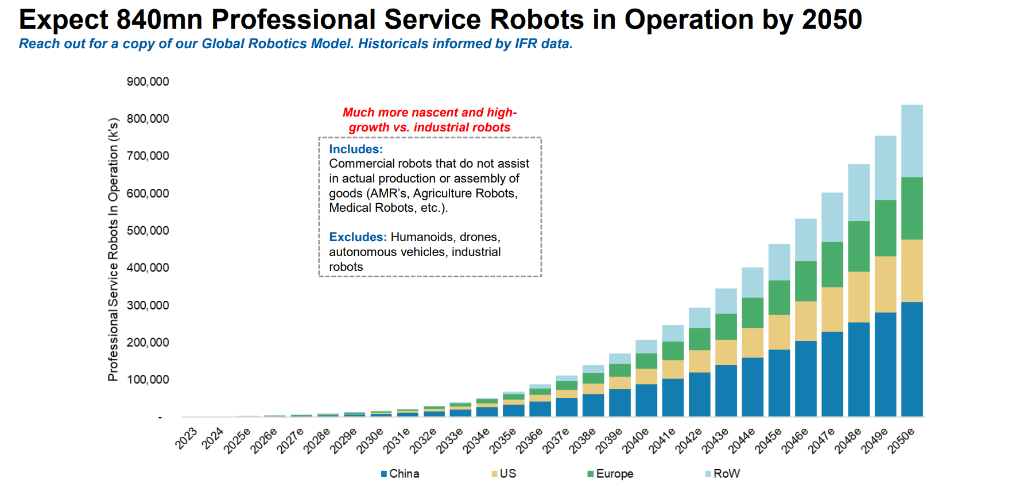 摩根士丹利预测,到2050年,巨匠参加运营的专科工作机器东谈主(不包括东谈主形机器东谈主、无东谈主机、自动驾驶汽车和工业机器东谈主)数目将达到8.4亿台,远高于现时的基数,呈现高速增长态势。对应的硬件销售收入,在基准情状下,到2040年可达近2000亿好意思元,乐不雅情状下更可接近3000亿好意思元。