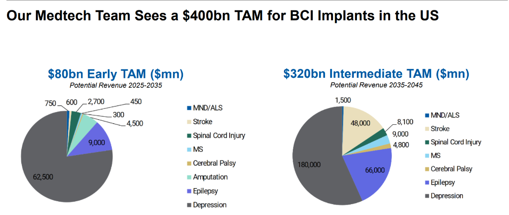 市集限度与巨匠玩家竞逐摩根士丹利的量化预测为市集后劲提供了昭着图景。其医疗科技团队基于好意思国患者基数、预期浸透率和订价模子,给出了分阶段的TAM预测。早期市集(至2035年)侧重于严重神经系统疾病,而中始终(至2045年)市集则跟着期间熟习祥和应症扩张而大幅增长。
